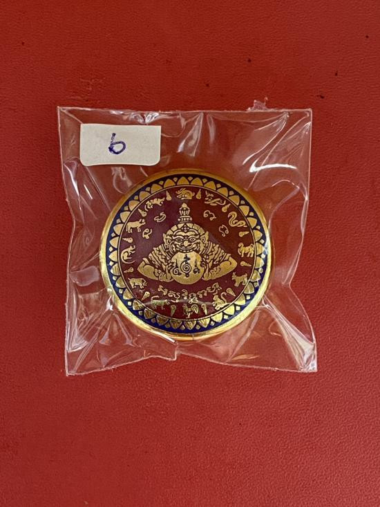 เคาะเดียวแดง สีผึ้งพระราหู รุ่น มงคลจักรวาล เนื้อ โลหะชุบทองลงยาสีแดงขอบสีน้ำเงิน ขนาด3.2ซม |