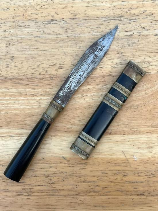 มีดหมอปากกา หลวงพ่อพันธ์ วัดเขาล้อนครสวรรค์ ด้ามงา กวักงา (ยาว 12.3 ซม.) หมายเลข ๑๘๓ |