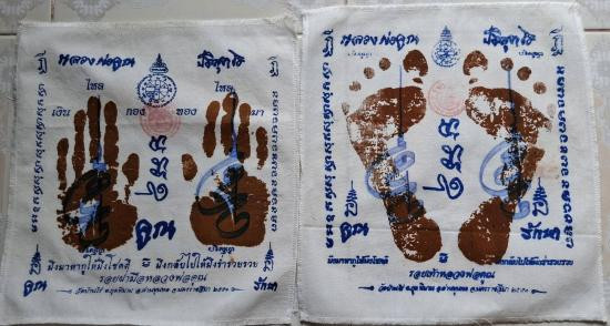 มาคู่ ผ้ายันต์ รอยมือ + รอยเท้า หลวงพ่อคูณ ปริสุทโธ วัดบ้านไร่ นครราชสีมา ปั๊มตราวัด ปี 2551 เเบบสกรีน ( พร้อมรอยจารหลวงพ่อทองศิษย์หลวงพ่อคูณ วัดบ้านไร่ เมตาจารหมึกให้ครับ ) |