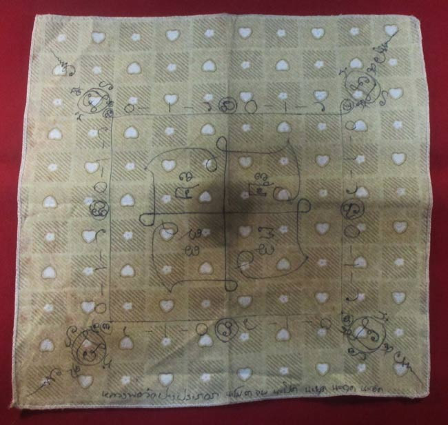 ผ้ายันต์ อภินันทนาการจาก กิตฺติธมฺโม สุนทรธมฺโม วัดอินทรวิหาร พระนคร ๑ มกราคม ๒๕๑๒ ครับ (พระบ้าน ครับ) |