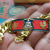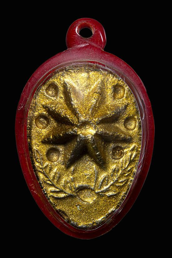 เคาะเดียวแดง สีผึ้งพระราหู รุ่น มงคลจักรวาล เนื้อ โลหะชุบทองลงยาสีดำขอบสีแดง ขนาด3.2ซม |