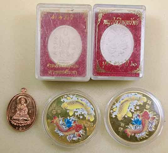 เหรียญ+พระผงเจ้าแม่กวนอิม + ผงพญาไ่ก่เรียกทรัพย์ บูชาดาว ปี 60 + เหรียญกลมโชคดี รูปปลาคราฟ 2 เหรียญ |