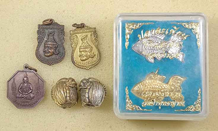 เหรียญมหาฤาษีศักดิ์สิทธิ์ พ่อแก่หลังบรมครูหมอชีวกโกมารทัต 2 เหรียญ +เหรียญปู่ฤาษีวีระตะเทพ นาคา เทวาศิลป์ กาญจนบุรี +ลูกอมต่อเงิน-ทอง วัดแค สุพรรณฯ 2 ลูก +ปลาตะเพียนเงินสะพัดทองร่ำรวย วัดป่าพุทธญาณ |