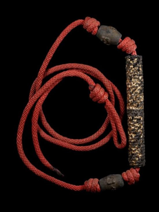 ตะกรุดเนื้อทองแดง ถักเชือกลงแล็คเกอร์บางๆ ไม่ทราบที่? |