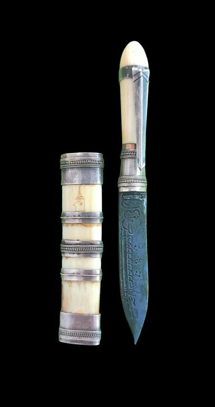 มีดหมอปากกา เหล็กน้ำพี้ (ปีกแมงทับ) ด้าม Rา ฝัก Rา หุ้มเงินแท้ ((*จารอักระบาลีหลายจุด)) |