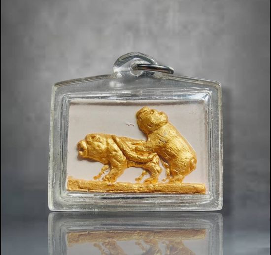 หมูขี่เสือ เนื้อผงพุทธคุณ ปัดทอง ครูบาคำเป็ง สำนักสงฆ์มะค่างาม จังหวัดกำแพงเพชร พร้อมเลี่ยมกันน้ำ |