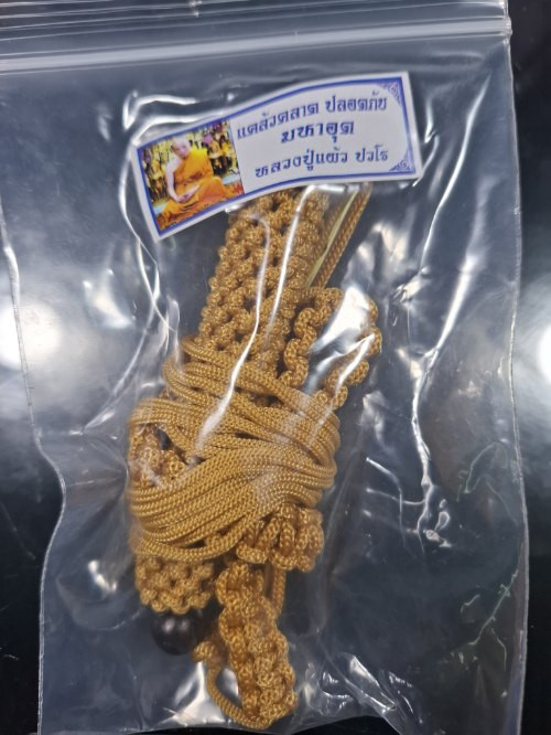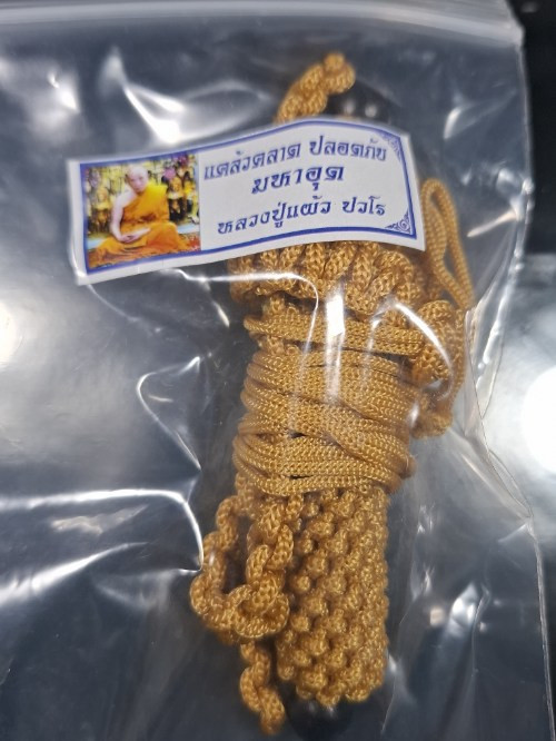 เบี้ยแก้ หุ้มจีวร ถักเชือก หลวงปู่ศิลา วัดโพธิ์ศรีสะอาด มีแผ่นเลขกำกับ ฝังตะกรุดทองเหลือง พร้อมใบคาถา ปี2567 |