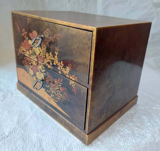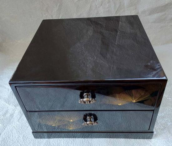 ***กล่องไม้วินเทจญี่ปุ่น งานฝีมือเก่า 2 ลิ้นชัก สามารถวางพระบูชา 5 นิ้วได้ สีดำลายทอง สภาพเก่าเก็บสวย |