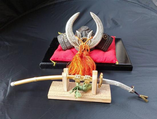 ***วัดใจ***หมวกซามูไรจำลองของโทกูงาวะ อิเอยาซุ (Tokugawa Ieyasu) ขนาดเล็ก เหล็กหล่อ งานเก่าญี่ปุ่น งานสะสม พร้อมแท่นที่รอง และพร้อมดาบคาตานะจำลอ |