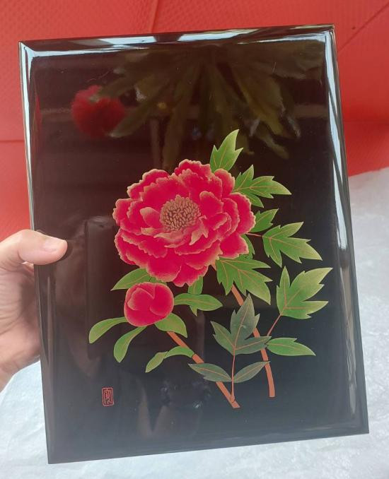 กล่องไม้เครื่องเขินญี่ปุ่น (Japanese lacquerware) ประเภทวาจิมะ-นูริ (Wajima-nuri) ลายดอกโบตั๋น ซึ่งเป็นสัญลักษณ์ของความมงคล บุสักหลาดอย่างดี ขนาด 9.5*12นิ้ว หนา 2.5 นิ้ว |