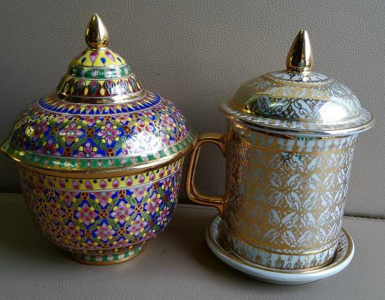 โถกับขวด กระเบื้องวินเทจมีฝาปิด ของสะสม |