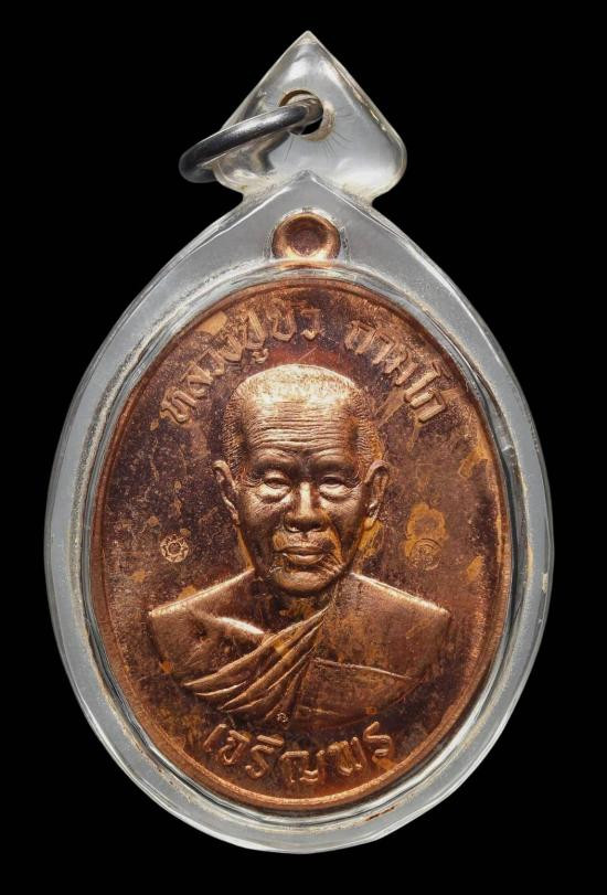 วัดใจเคาะเดียว เสมา 8 รอบ หลวงปู่บัว เนื้อทองแดง โบราณ หมายเลข 6819 เลี่ยมกรอบชุบทอง |
