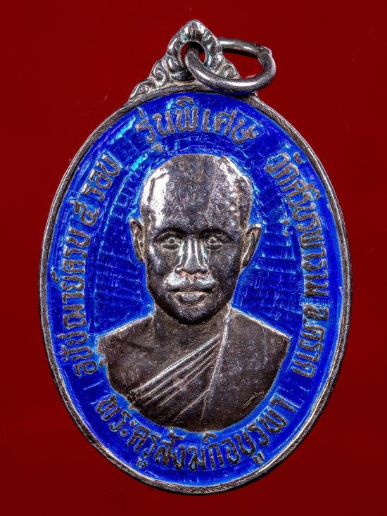เหรียญหยดน้ำ 85 ถามโก รุ่น สร้างโรงเรียนปริยัติธรรมเนื้อเงินลงยาสีแดงกนกน้ำเงินหมายเลข 7 พระครูสังฆกิจบูรพา(หลวงปู่บัว ถามโก) วัดศรีบุรพาราม(เกาะตะเคียน) จ.ตราด |