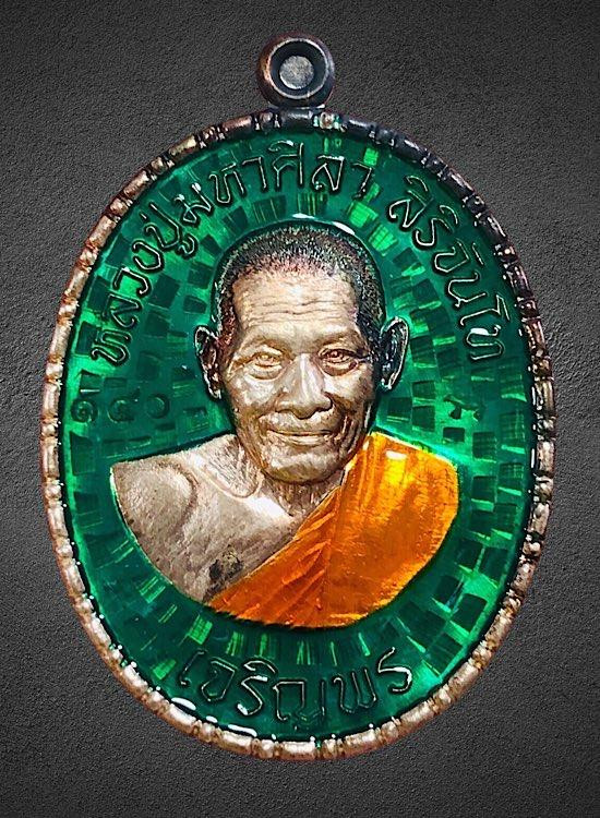 หลวงปู่มหาศิลา เจริญพรล่าง77 ปี64 เนื้อเงินลงยาเขียว ขึ้นรุ้งบางๆ จมูก100 เลข140กล่องเดิม พระสวยนิยมคัดสวยๆ ยุดต้นหมุนเวียนน้อย
