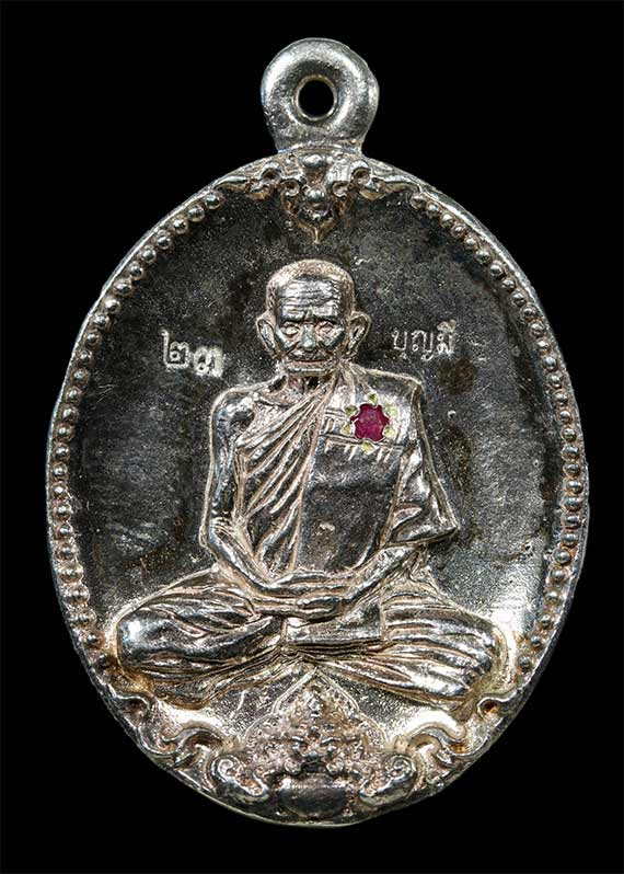 หลวงปู่บุญเหลือ อภิปุญโญ รุ่นแรก วัดป่าบ้านเปือย จ.สกลนคร เนื้อเงินลงยาแดง หน้ากากทองคำ หมายเลข 29 สร้างทั้งหมด 29 เหรียญ |