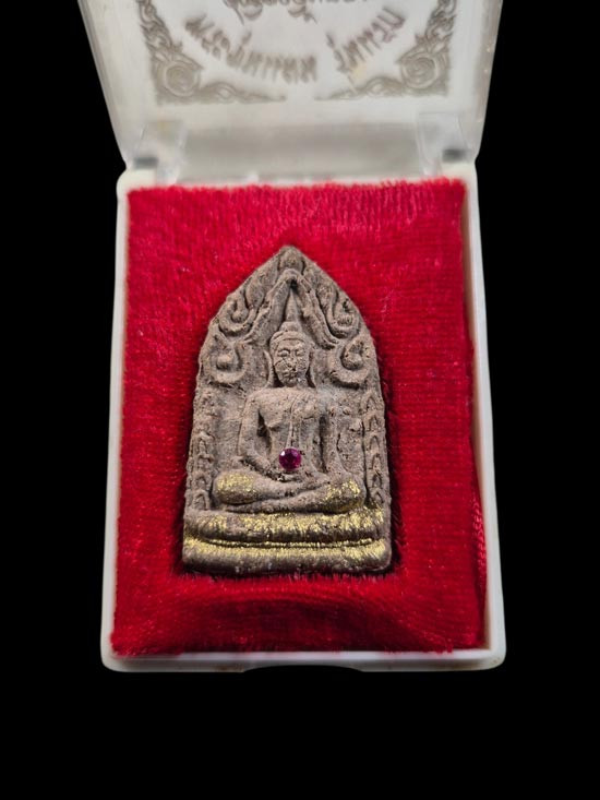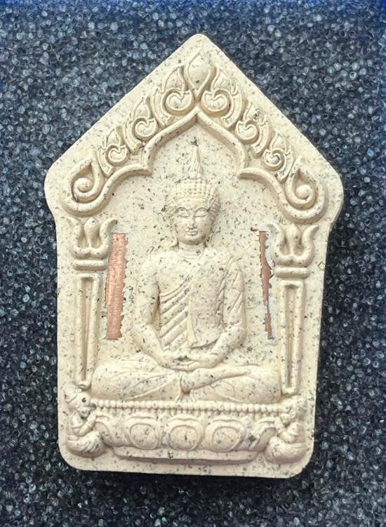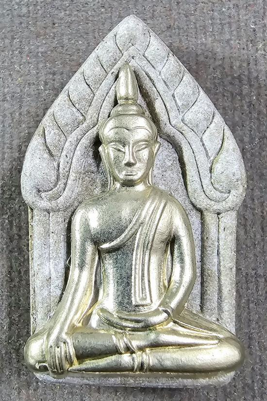 พระผงขุนแผน(พิมพ์กลาง) รุ่น "ศิลา พรมหามงคล" หลวงปู่มหาศิลา สิริจันโท ออกวัดโพธิ์ศรีสะอาด เนื้อเทาผงธูป หน้ากากทองขาว หลังโค๊ดหมายเลข ๓๑...โค๊ดอักษร "ศ" ในรัศมี มีเพียง 1 องค์ในลัง รุ่นนี้เป็นพิมพ์ก |