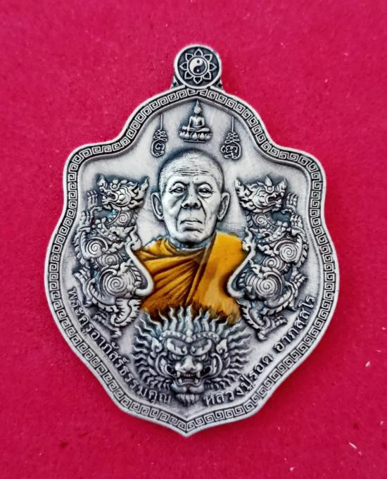 หลวงปู่รอด อาภัสสโร เหรียญมังกรรวยรับทรัพย์ เนื้อเงินรมซาติน ลงยาจีวร NO.๑๑๘ |