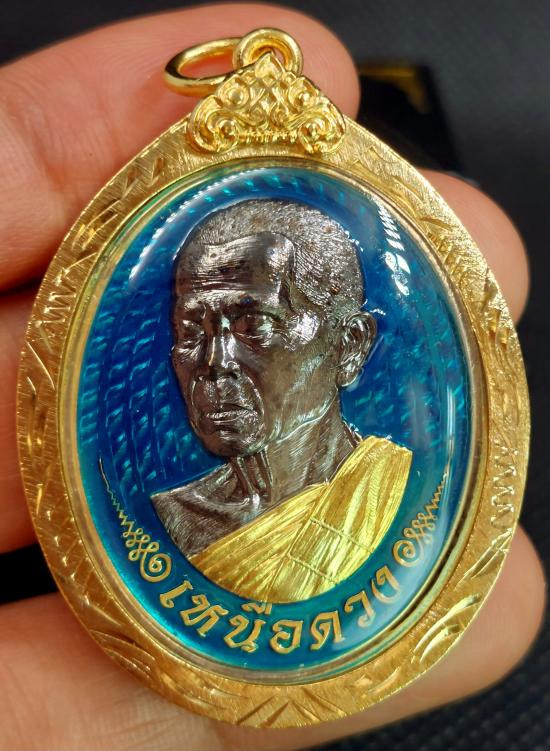 เหรียญเจริญพรเมตตามหานิยม หลวงปู่นิยม กมโล เนื้อเงินลงยาฟ้า เลข ๗ วัดแจ้งนอก ปี 2555 |