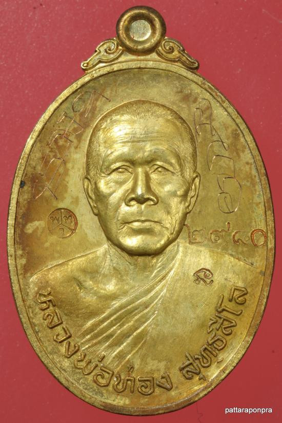 เหรียญหลวงพ่อทอง รุ่นลาภยศ ปี 2557 เนื้อกะใหล่ทอง มีจารหลวงพ่อ หมายเลข 2980 |
