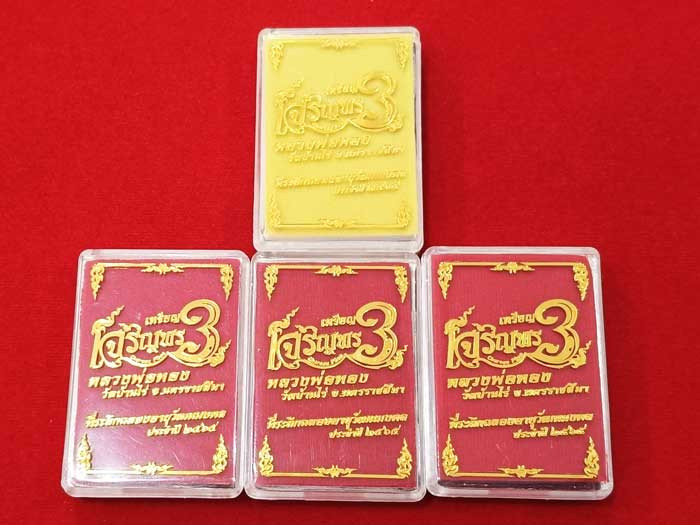 วัดใจ 100 เดียวแดง ++ เหรียญเจริญพร 3 หลวงพ่อทอง วัดบ้านไร่ (4 เหรียญ กล่องเดิม) |