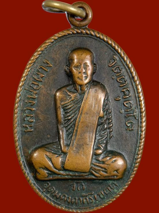 เหรียญรุ่นแรกหลวงปู่ดี วํสปญฺโญ วัดบ้านคำฮี (วัดศรีมุณฑา) อำเภอมุกดาหาร (ปัจจุบันเป็น จังหวัดมุกดาหาร) จังหวัดนครพนม สร้างปี พ.ศ. 2518 เนื้อทองแดงกะไหล่เงินบล็อกแรก |