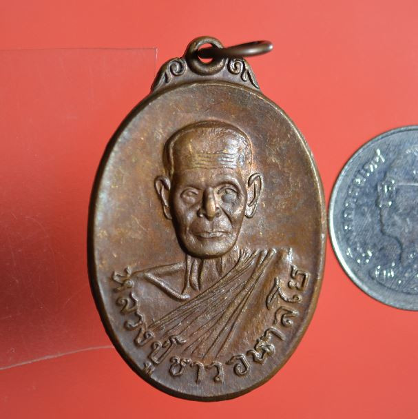 เหรียญหลวงปู่ขาว วัดถ้ำกลองเพล รุ่นหลังยันต์กระบองไขว้ ปี 2518 เนื้อทองแดงรมน้ำตาล เคาะเดียวแดง |