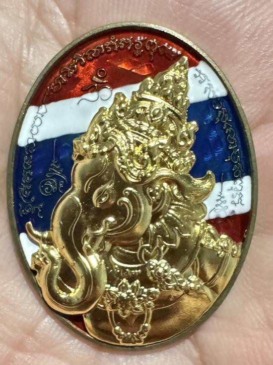เหรียญพระพิฆเนศ หลัง พระพรหม เนื้อชนวนลงยาธงชาติแนวเอียง หน้ากากชุบทอง ตอกโค๊ต โอม ตอกหมายเลข 24 รุ่นอิ่มทรัพย์ หลวงปู่อิ่ม วัดทุ่งนาใหม่ นครศรีธรรมราช
