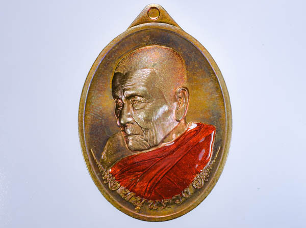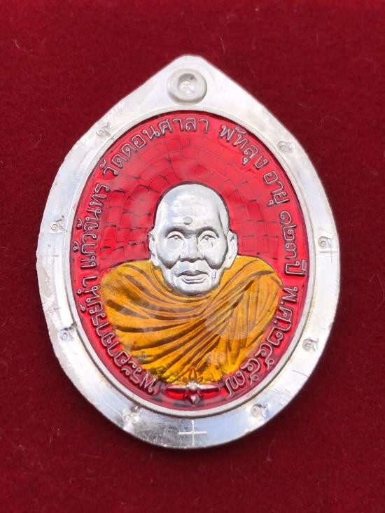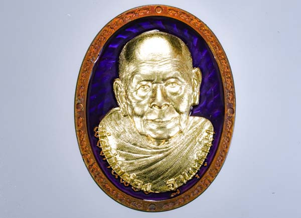 เหรียญเลื่อนสมณศักดิ์ เนื้อทองเหลืองลงยาจีวร ฝังพลอยแดง พระอาจารย์ประสูติ วัดในเตา จ.ตรัง |