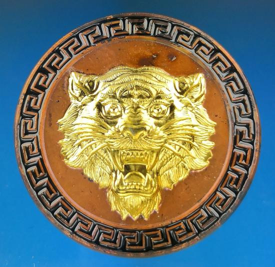 เหรียญโชคดี พญาเสือนอนกิน รุ่นแรก พระอาจารย์ประสูติ (หลวงพ่อประสูติ) วัดในเตา จ.ตรัง เนื้อทองทิพย์ลงยาแดง หน้ากากเสือโลหะอาถรรพ์ หมายเลข 87 พร้อมกล่องเดิม |