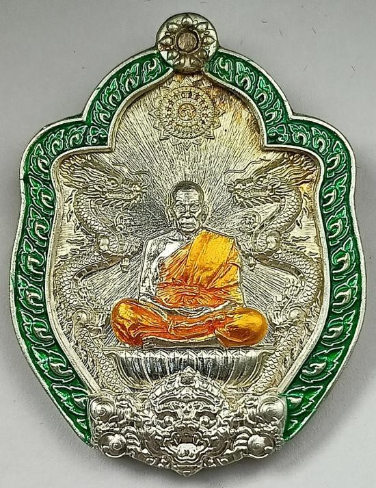 (เลขเดี่ยวสวย เบอร์8) เหรียญมังกรคู่นั่งพาน (คันฉ่องดูดทรัพย์) หลวงพ่อพัฒน์ วัดห้วยด้วน เนื้อเงินลงยาขอบ/จีวร "หลังติดคันฉ่อง" เบอร์ 8 พร้อมกล่องครับ (เหรียญหนัก 26.35กรัม )