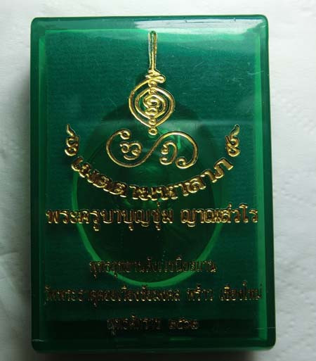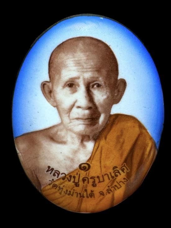 ล็อกเก็ตฉากฟ้า รุ่น๑ หลวงปู่ครูบาเลิศ วัดทุ่งม่ามใต้ จ. ลำปร าง ด้านหลังแผ่นทองแดงปั๊มยันต์ตุ๊กตาล้มลุก ตอกโค๊ต บ.ล. |