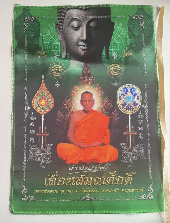 ผ้ายันต์ เลื่อนสมณศักดิ์ หลวงพ่อพัฒน์ วัดห้วยด้วน จ.นครสวรรค์ ผืนใหญ่ กว้าง 34 ซม สูง 47 ซม สีเขียว เลข 218 วาระดี พิธีใหญ่ |