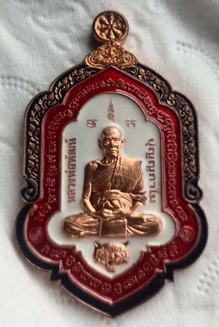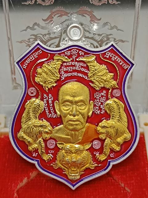 เหรียญ รุ่น พยัคฆ์ปุญญกาโม หลวงพ่อพัฒน์ ปุญฺญกาโม วัดห้วยด้วน อ.หนองบัว จ.นครสวรรค์ (ขนาดเหรียญสูง 4.5 ซม.) เนื้อชุบ 2 กษัตริย์ พ่นทรายลงยาแดงจีวรส้ม เลขเรียง 123 |