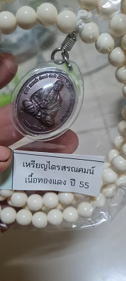 เหรียญไตรสรณคมน์ เนื้อทองแดง หลวงตาม้า วัดถ้ำเมืองนะ พร้อมรอยจารหลวงตาม้า เลี่ยมจากวัดพร้อมประคำ |
