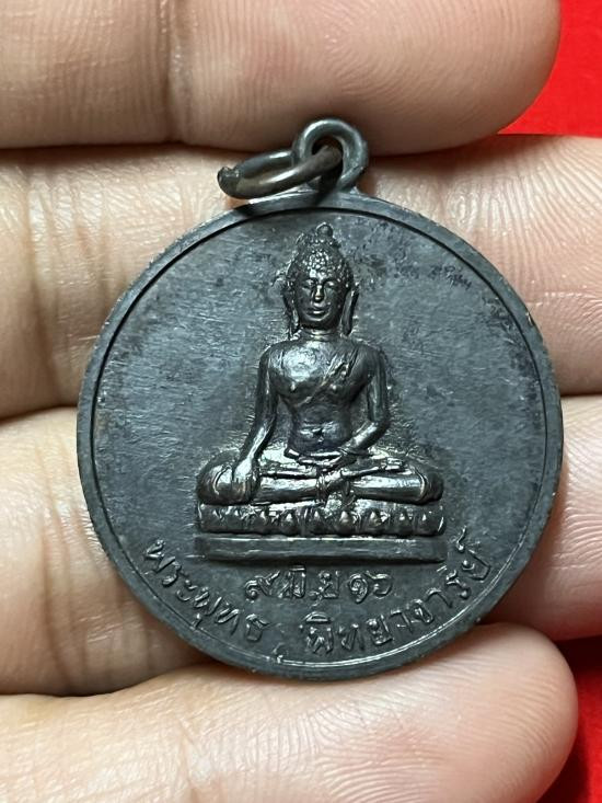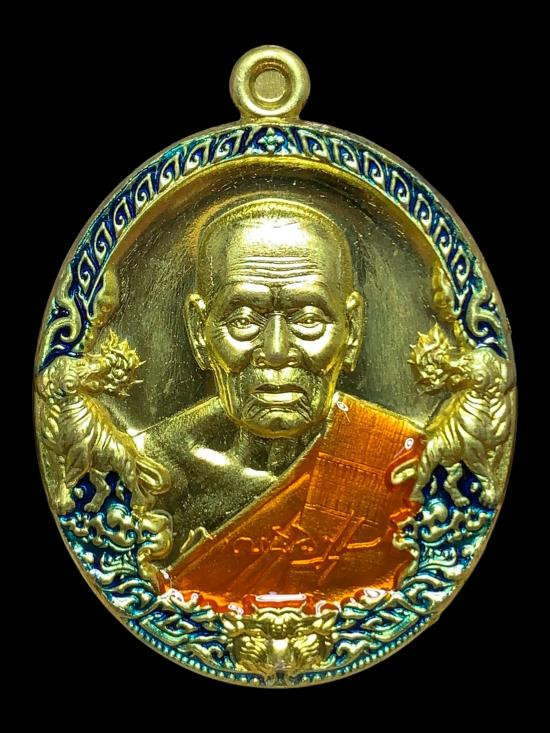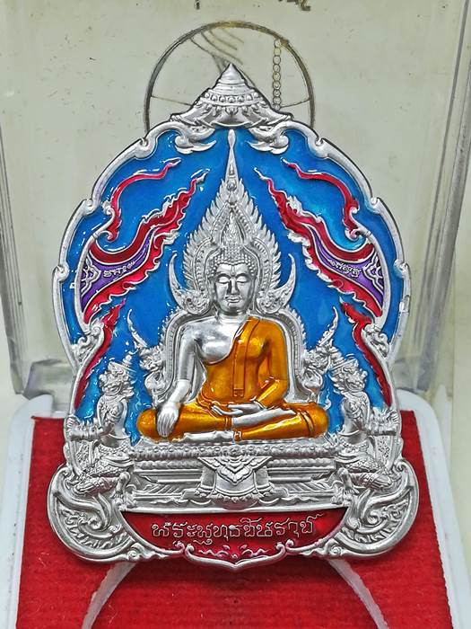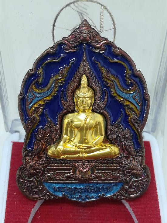 เหรียญ พระพุทธชินราช รุ่น มหาจักรพรรดิ์ หลวงพ่อพัฒน์ ปุญญากาโม วัดห้วยด้วน จ.นครสวรรค์ (ขนาดเหรียญสูง 4.5 ซม.) เนื้อสัตตะลงยาฟ้า หน้ากากชุบทอง หมายเลข 80