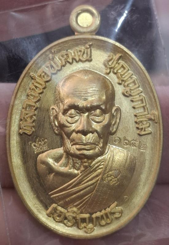 เหรียญเจริญล่าง 65ขอบเรียบ หลวงพ่อพัฒน์ ปุญฺญกาโม เนื้อทองฝาบาตร เลข ๑๖๕๒ สวยๆ พร้อมกล่องเดิม |