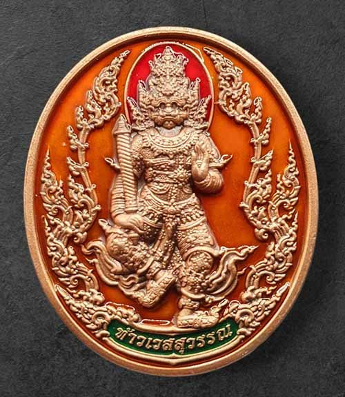 เหรียญท้าวเวสสุวรรณ รุ่น ยกฐานะ พลิกชีวิต เนื้อทองแดงซาติน ลงยาสีส้ม หมายเลข 27 เจ้าคุณพัฒน์ ปุณญกาโม วัดห้วยด้วน จังหวัด นครสวรรค์