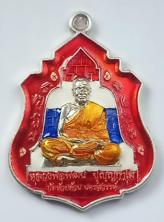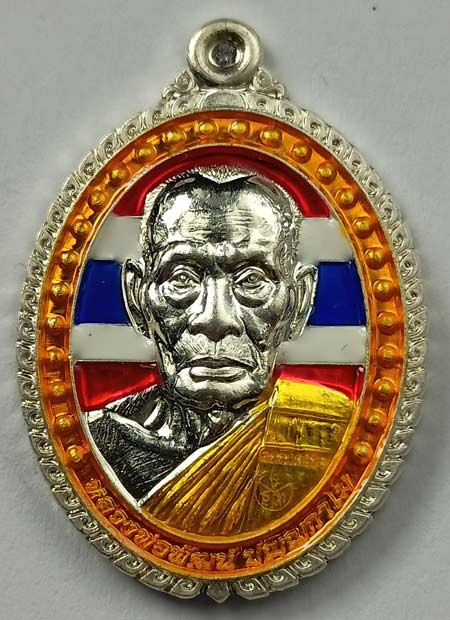 เหรียญเสมาหันข้าง หลวงพ่อพัฒน์ วัดห้วยด้วน เนื้อเงินลงยาลายธงชาติ หมายเลข 17 |