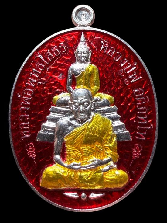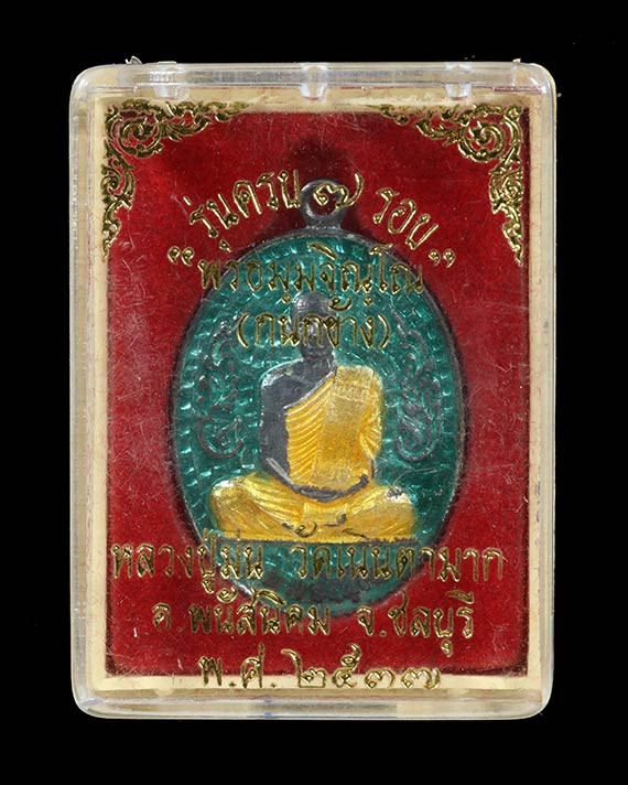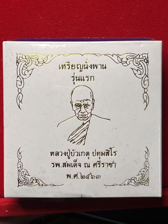 เหรียญนั่งพานสำเภาทอง หลวงปู่ฮก วัดราษฏร์เรืองสุข จ.ชลบุรี ปี พ.ศ.2558 เนื้ออาบเงิน ลงยาสี ตอกโค้ต หมายเลข 5141 ซีลเดิม พร้อมกล่อง ผิวสวยๆ |