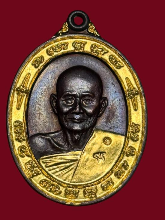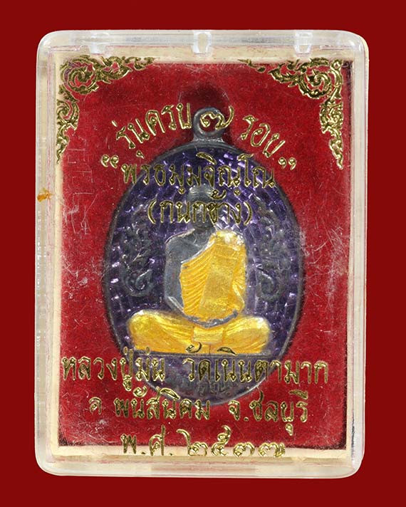 -วัดใจเคาะเดียวแดง- เหรียญไตรมาสเนื้อทองแดงลงยาสีทอง หลวงปู่ม่น วัดเนินตามาก ปี 37 |
