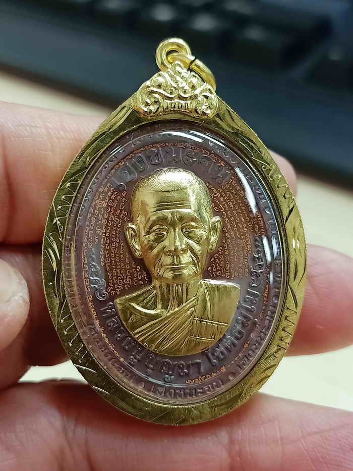 เหรียญเจริญพรบน ปี 2565 เนื้อทองทิพย์ หน้ากากเงิน ( แยกชุดกรรมการ ) โค๊ต กรรมการ หมายเลข 148 สร้างน้อย 199 เหรียญ หลวงปู่เปลว วัดเจ็ดลูกเนิน เลี่ยมพลาสติก ( ไม่มีกล่อง ) ขนาดความสูงจากหูเหรียญ 4 ซม |