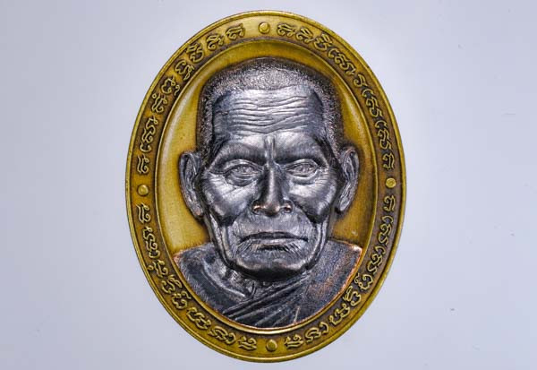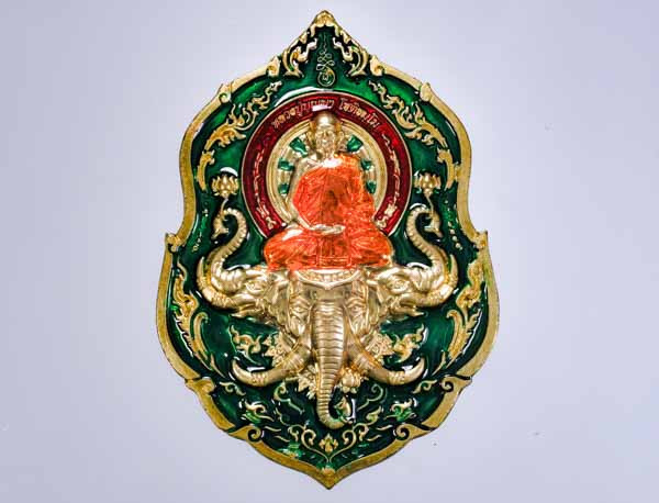 พิมพ์เล็ก สวย-100-เหรียญเสมา เจ้าพ่อเขาใหญ่ เกาะสีชัง จ.ชลบุรี เนื้อกะไหล่ทองลงยาสีน้ำเงิน |