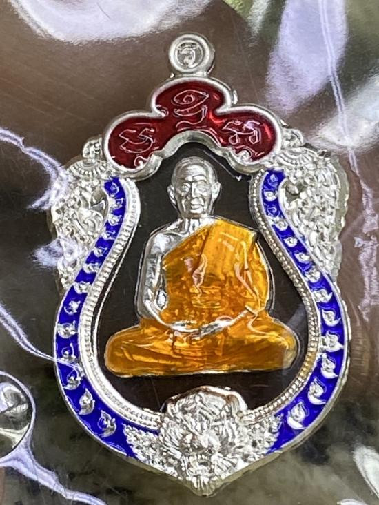 เหรียญใบสาเก หลวงปู่คร่ำ วัดวังหว้า ระยอง รุ่นมงคล38 เนื้อเงินลงยา ปี2537 มีกล่อง |