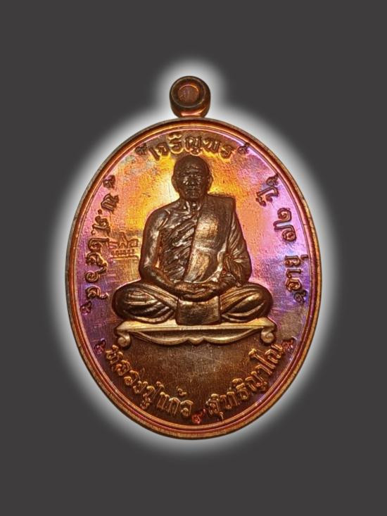 A1420.เหรียญเจริญพร หลวงปู่แก้ว วัดเขาไม้เเก้ว ทองเเดงรมรุ้งสวยมาก เลข 105 กล่องเดิม |