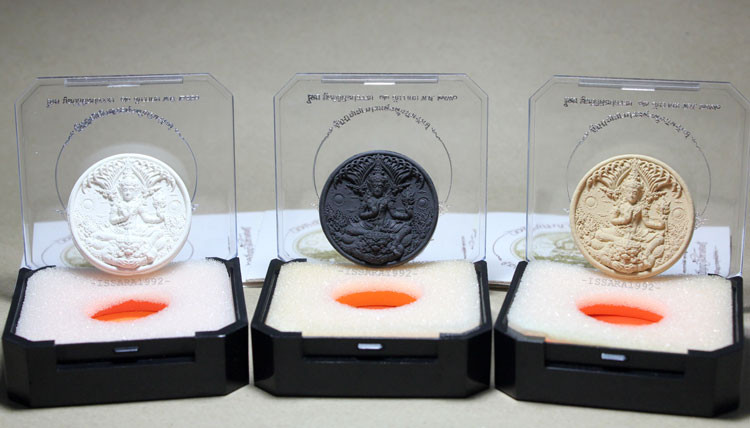 กราบขออนุญาตท่านอ.เฉลิมชัย โฆษิตพิพัฒน์ นำเสนอ อภิปัญญามหาเศรษฐี พิมพ์ใหญ่ ขนาด 5.5 ซม. เนื้อผงพุทธคุณ 1 ชุด สามสี พร้อมกล่องเดิม |