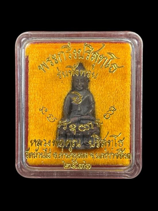 พระกริ่งหล่อโบราณดินไทย รุ่นมงคลมหาลาภ หลวงปู่บัว ถามโก ปี2554 สภาพสวพร้อมกล่องเดิมคะ |