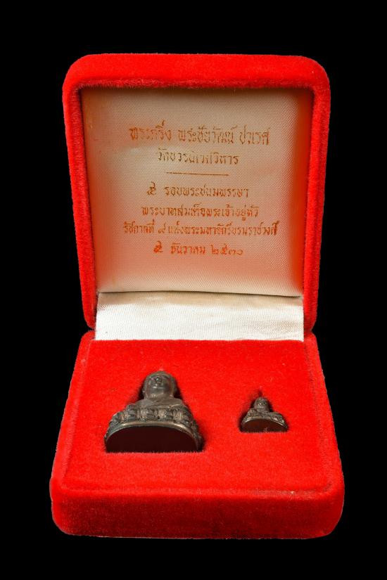 ชุดพระกริ่งและพระชัยวัฒน์ หลวงปู่คร่ำ วัดวังหว้า จ.ระยอง รุ่นสรงน้ำเสาร์ 5 พ.ศ.2537 เนื้อนวะโลหะเต็มสูตรก้นแผ่นเงิน ตอกโค๊ต ตอกเลข สภาพสวยนอนนิ่งกล่องกำะหยี่สีแดงเดิมๆ !! |