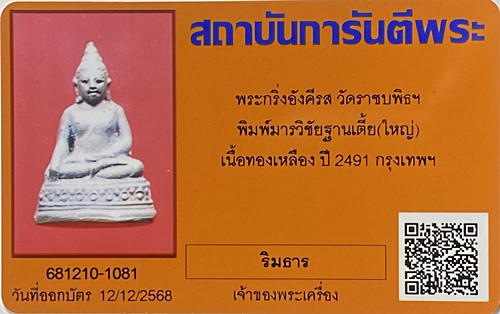 พระกริ่งอังคีรส วัดราชบพิธฯ พิมพ์มารวิชัยฐานสูง(พิมพ์ใหญ่) ปี2491 มีบัตรรับรองจีพระ เคาะเดียว |
