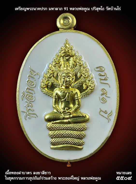 เหรียญพระนาคปรก หลวงพ่อคูณ รุ่นมหาลาภ 91 ปี 2557 เนื้อทองฝาบาตรลงยาสีขาว หมายเลข ๕๕๐๙ ในชุดกรรมการอุปถัมภ์ร่วมสร้าง |