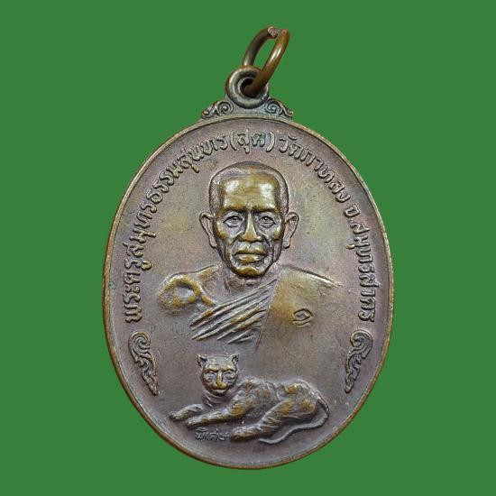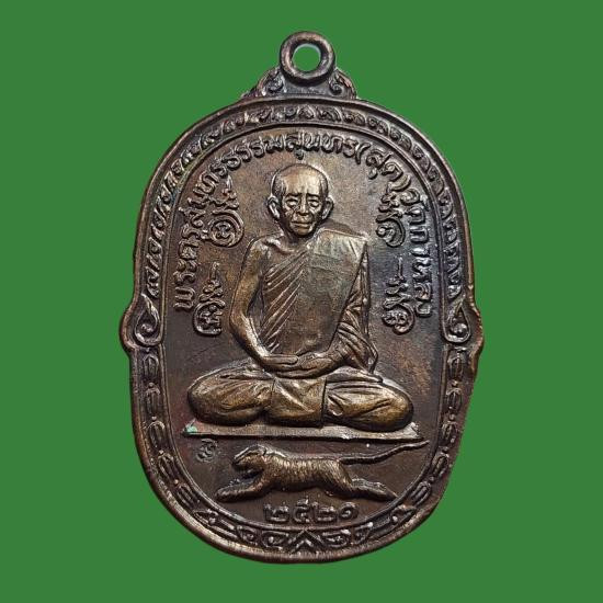 วัดใจ เหรียญ(เสือกลับ) หลวงพ่อสุด วัดกาหลง จ.สมุทรสาคร ออกวัดรวกสุทธาราม ปี๒๕๒๑ รุ่นสาริกา หลังยันต์ เนื้อทองแดง |
